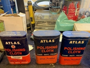 3 cans of Blue Coral sealer never used and 3 cans of Atlas Polishing Cloth never used.
